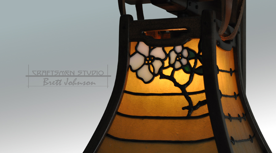 The Silverlake wall sconce is a faithful reproduction of a Greene & Greene lighting design inspired by the historic Gamble House in Pasadena, California. Handcrafted from rich African mahogany with genuine ebony inlay, this Arts and Crafts wall sconce features a distinctive bell-shaped lantern suspended by leather straps from the wall mount. The hand-leaded stained glass panels glow warmly, creating an inviting ambiance that embodies the spirit of early 1900s Craftsman architecture. Perfect for hallways, entryways, or living spaces, the Silverlake sconce brings timeless Greene & Greene elegance and true Arts and Crafts craftsmanship into any home.